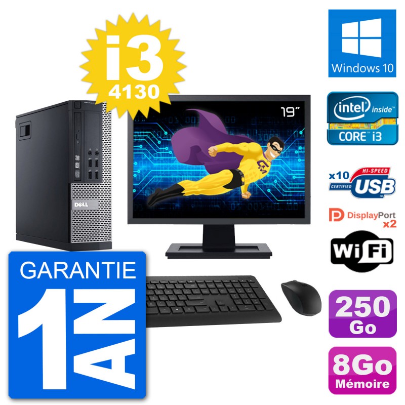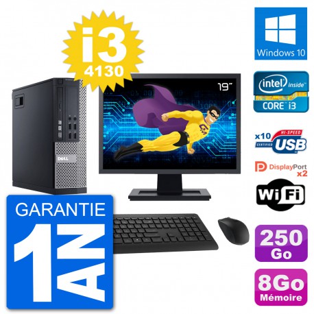 PC Dell 9020 SFF - Intel Core i3-4130 3.4 Ghz (3 Mo) - 8 Go DDR3 - Disque Dur 3,5" 250 Go - Graveur DVD - Clef Wifi USB - Windows 10 - Livré avec Ecran 19" + clavier + souris (Marques et modèles variables) - Garantie 1 an.