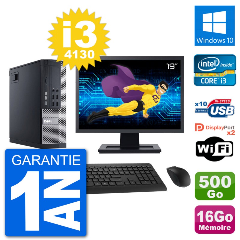 PC Dell 9020 SFF - Intel Core i3-4130 3.4 Ghz (3 Mo) - 16 Go DDR3 - Disque Dur 3,5" 500 Go - Graveur DVD - Clef Wifi USB - Windows 10 - Livré avec Ecran 19" + clavier + souris (Marques et modèles variables) - Garantie 1 an.