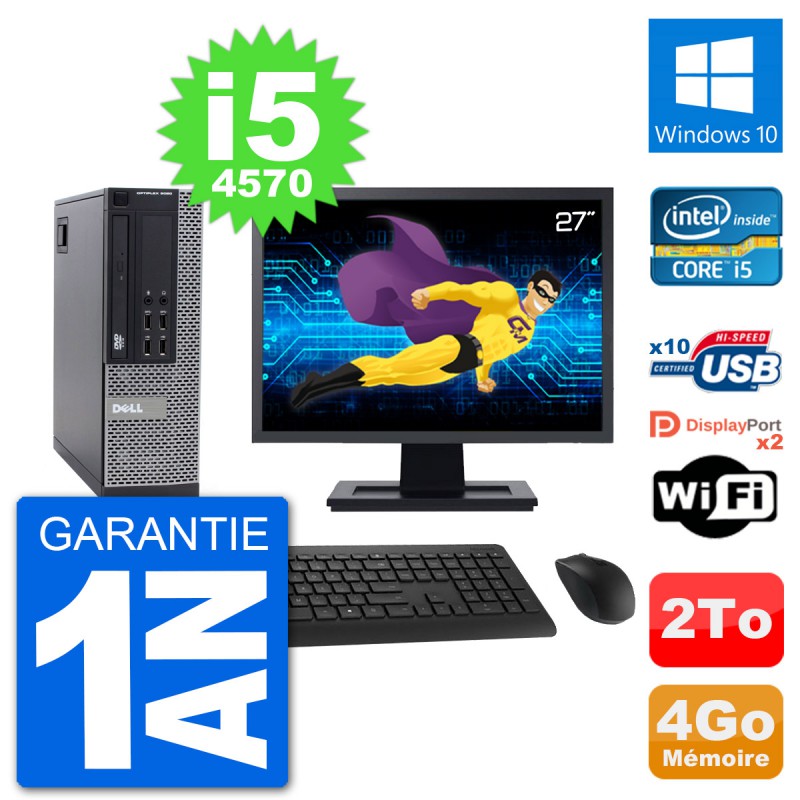 PC Dell 9020 SFF - Intel Core i5-4570 3.2 Ghz (6 Mo) - 4 Go DDR3 - Disque Dur 3,5" 2 To - Graveur DVD - Clef Wifi USB - Windows 10 - Livré avec Ecran 27" + clavier + souris (Marques et modèles variables) - Garantie 1 an.