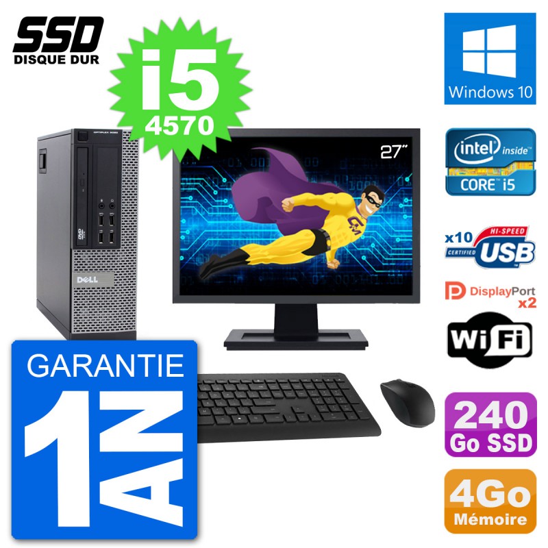 PC Dell 9020 SFF - Intel Core i5-4570 3.2 Ghz (6 Mo) - 4 Go DDR3 - Disque Dur SSD 240 Go - Graveur DVD - Clef Wifi USB - Windows 10 - Livré avec Ecran 27" + clavier + souris (Marques et modèles variables) - Garantie 1 an.
