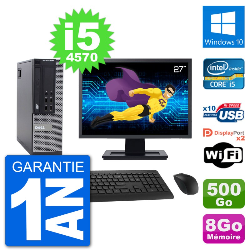PC Dell 9020 SFF - Intel Core i5-4570 3.2 Ghz (6 Mo) - 8 Go DDR3 - Disque Dur 3,5" 500 Go - Graveur DVD - Clef Wifi USB - Windows 10 - Livré avec Ecran 27" + clavier + souris (Marques et modèles variables) - Garantie 1 an.