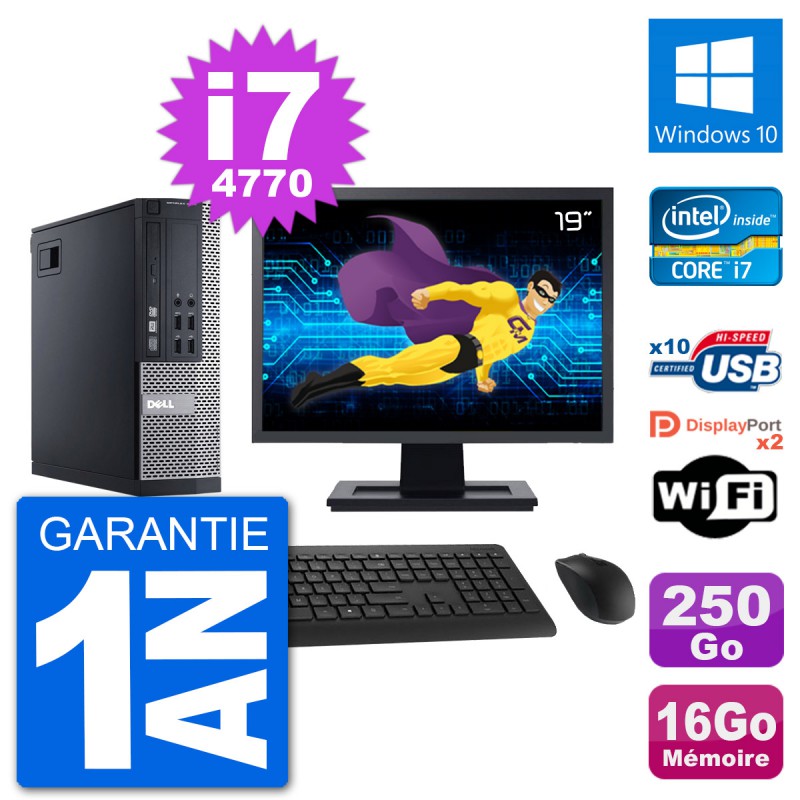 PC Dell 9020 SFF - Intel Core i7-4770 3.4 Ghz (8 Mo) - 16 Go DDR3 - Disque Dur 3,5" 250 Go - Graveur DVD - Clef Wifi USB - Windows 10 - Livré avec Ecran 19" + clavier + souris (Marques et modèles variables) - Garantie 1 an.