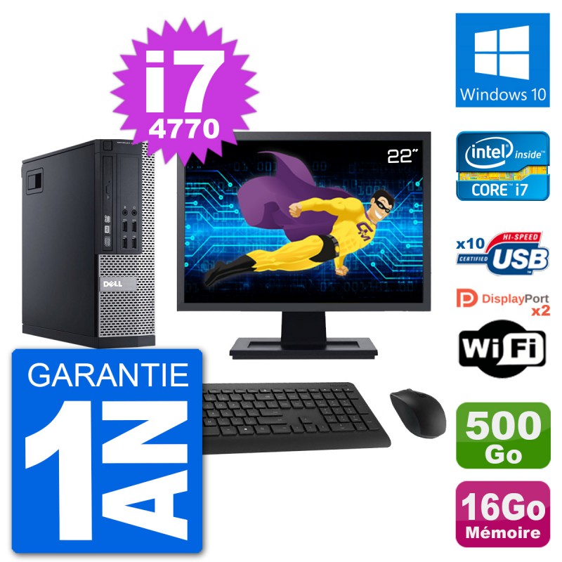 PC Dell 9020 SFF - Intel Core i7-4770 3.4 Ghz (8 Mo) - 16 Go DDR3 - Disque Dur 3,5" 500 Go - Graveur DVD - Clef Wifi USB - Windows 10 - Livré avec Ecran 22" + clavier + souris (Marques et modèles variables) - Garantie 1 an.