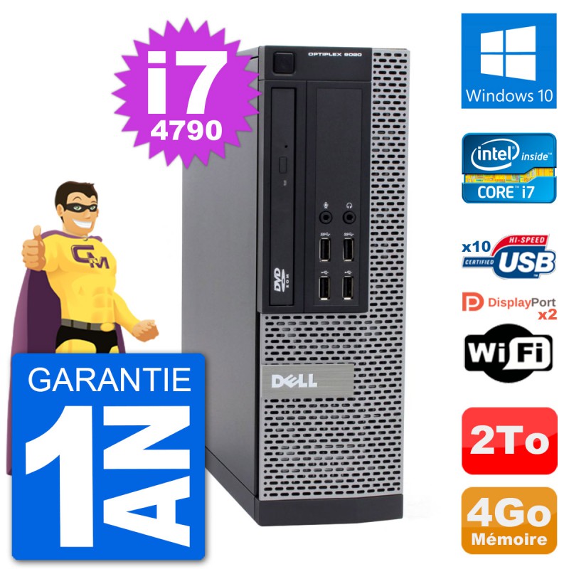 PC Dell Optiplex 9020 SFF (Slim) - Intel Core i7-4790 3.6 Ghz (8 Mo) - 4 Go DDR3 - Disque Dur 3,5" 2 To - Graveur DVD - Clef Wifi USB - Windows 10 - Garantie 1 an.