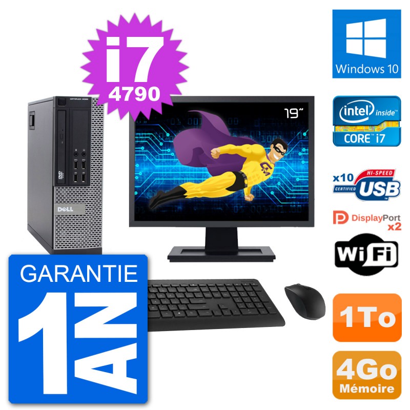 PC Dell 9020 SFF - Intel Core i7-4790 3.6 Ghz (8 Mo) - 4 Go DDR3 - Disque Dur 3,5" 1 To - Graveur DVD - Clef Wifi USB - Windows 10 - Livré avec Ecran 19" + clavier + souris (Marques et modèles variables) - Garantie 1 an.