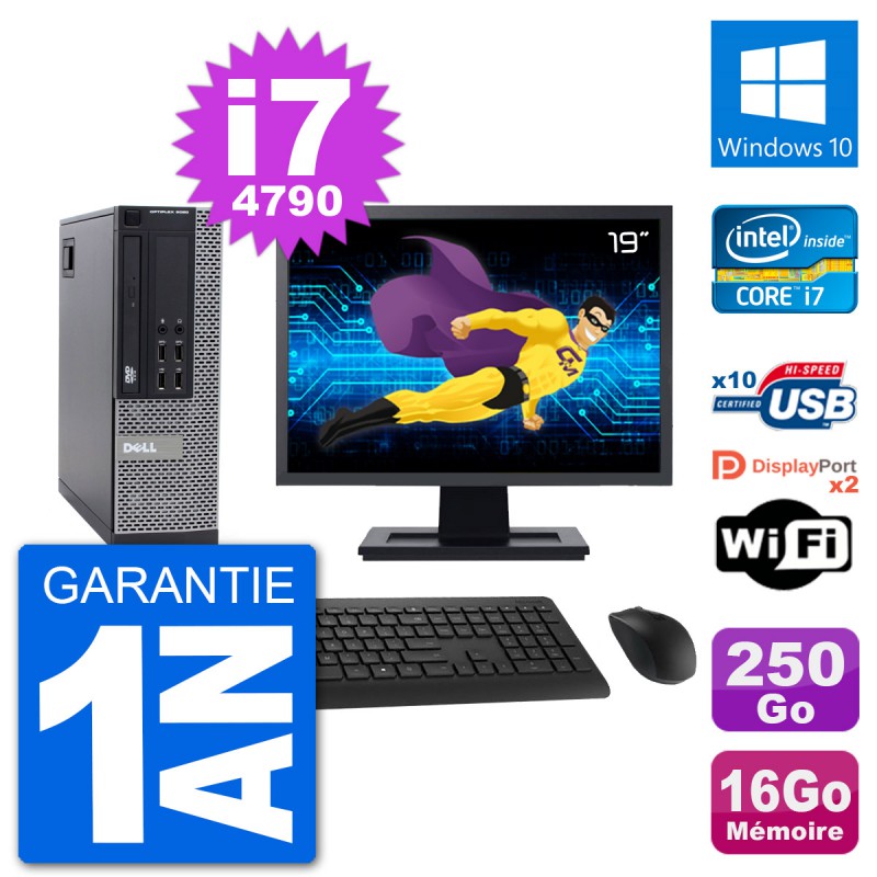 PC Dell 9020 SFF - Intel Core i7-4790 3.6 Ghz (8 Mo) - 16 Go DDR3 - Disque Dur 3,5" 250 Go - Graveur DVD - Clef Wifi USB - Windows 10 - Livré avec Ecran 19" + clavier + souris (Marques et modèles variables) - Garantie 1 an.