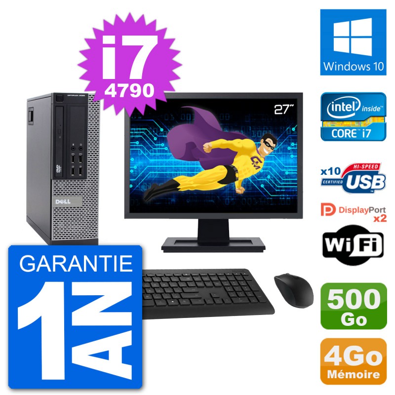 PC Dell 9020 SFF - Intel Core i7-4790 3.6 Ghz (8 Mo) - 4 Go DDR3 - Disque Dur 3,5" 500 Go - Graveur DVD - Clef Wifi USB - Windows 10 - Livré avec Ecran 27" + clavier + souris (Marques et modèles variables) - Garantie 1 an.