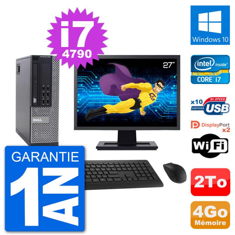 PC Dell 9020 SFF - Intel Core i7-4790 3.6 Ghz (8 Mo) - 4 Go DDR3 - Disque Dur 3,5" 2 To - Graveur DVD - Clef Wifi USB - Windows 10 - Livré avec Ecran 27" + clavier + souris (Marques et modèles variables) - Garantie 1 an.