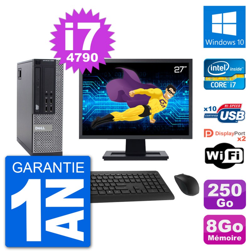 PC Dell 9020 SFF - Intel Core i7-4790 3.6 Ghz (8 Mo) - 8 Go DDR3 - Disque Dur 3,5" 250 Go - Graveur DVD - Clef Wifi USB - Windows 10 - Livré avec Ecran 27" + clavier + souris (Marques et modèles variables) - Garantie 1 an.