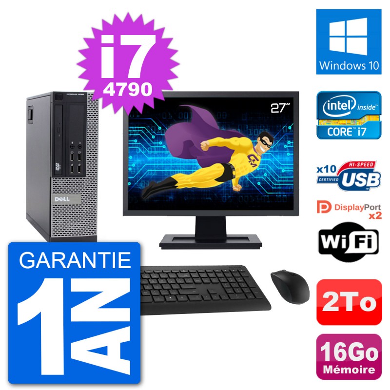 PC Dell 9020 SFF - Intel Core i7-4790 3.6 Ghz (8 Mo) - 16 Go DDR3 - Disque Dur 3,5" 2 To - Graveur DVD - Clef Wifi USB - Windows 10 - Livré avec Ecran 27" + clavier + souris (Marques et modèles variables) - Garantie 1 an.