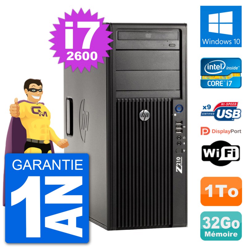 PC Tour HP WorkStation Z210 - Intel Core i7-2600 3.4 Ghz (8 Mo) - 32 Go DDR3 - Disque Dur 3,5" 1 To - Graveur DVD - Clef Wifi USB - Windows 10 - Garantie 1 an.