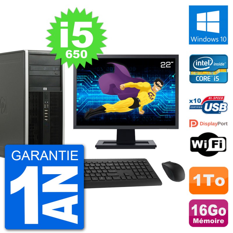 PC Tour HP 8100 Elite - Intel Core i5-650 3.2 Ghz (4 Mo) - 16 Go DDR3 - Disque Dur 3,5" 1 To - Graveur DVD - Clef Wifi USB - Windows 10 - Livré avec Ecran 22" + clavier + souris (Marques et modèles variables) - Garantie 1 an.