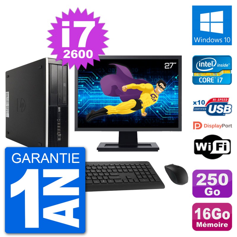 PC HP Compaq 6200 Pro SFF (Slim) - Intel Core i7-2600 3.4 Ghz (8 Mo) - 16 Go DDR3 - Disque Dur 3,5" 250 Go - Graveur DVD - Clef Wifi USB - Windows 10 - Livré avec Ecran 27" + clavier + souris (Marques et modèles variables) - Garantie 1 an.