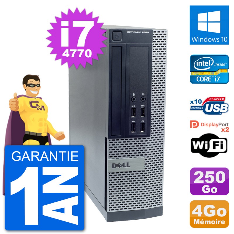 PC Dell OptiPlex 7020 SFF (Slim) - Intel Core i7-4770 3.4 Ghz (8 Mo) - 4 Go DDR3 - Disque Dur 3,5" 250 Go - Graveur DVD - Clef Wifi USB - Windows 10 - Garantie 1 an.
