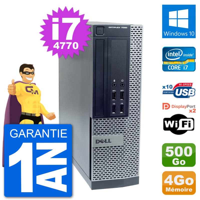 PC Dell OptiPlex 7020 SFF (Slim) - Intel Core i7-4770 3.4 Ghz (8 Mo) - 4 Go DDR3 - Disque Dur 3,5" 500 Go - Graveur DVD - Clef Wifi USB - Windows 10 - Garantie 1 an.