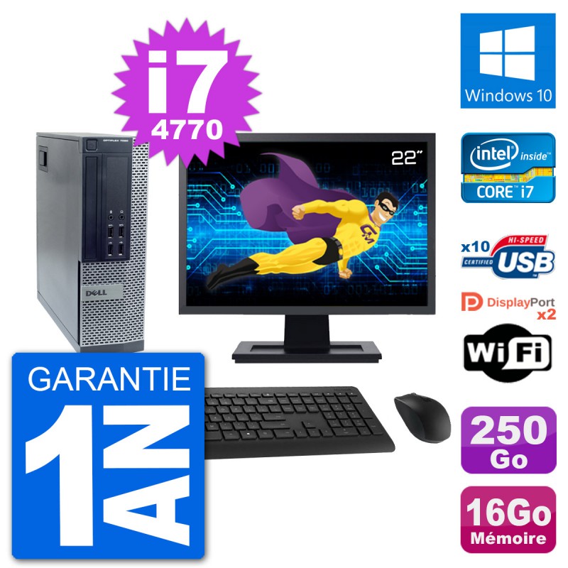 PC Dell 7020 SFF (Slim) - Intel Core i7-4770 3.4 Ghz (8 Mo) - 16 Go DDR3 - Disque Dur 3,5" 250 Go - Graveur DVD - Clef Wifi USB - Windows 10 - Livré avec Ecran 22" + clavier + souris (Marques et modèles variables) - Garantie 1 an.