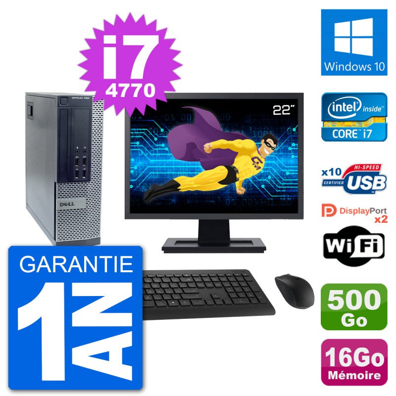 PC Dell 7020 SFF (Slim) - Intel Core i7-4770 3.4 Ghz (8 Mo) - 16 Go DDR3 - Disque Dur 3,5" 500 Go - Graveur DVD - Clef Wifi USB - Windows 10 - Livré avec Ecran 22" + clavier + souris (Marques et modèles variables) - Garantie 1 an.