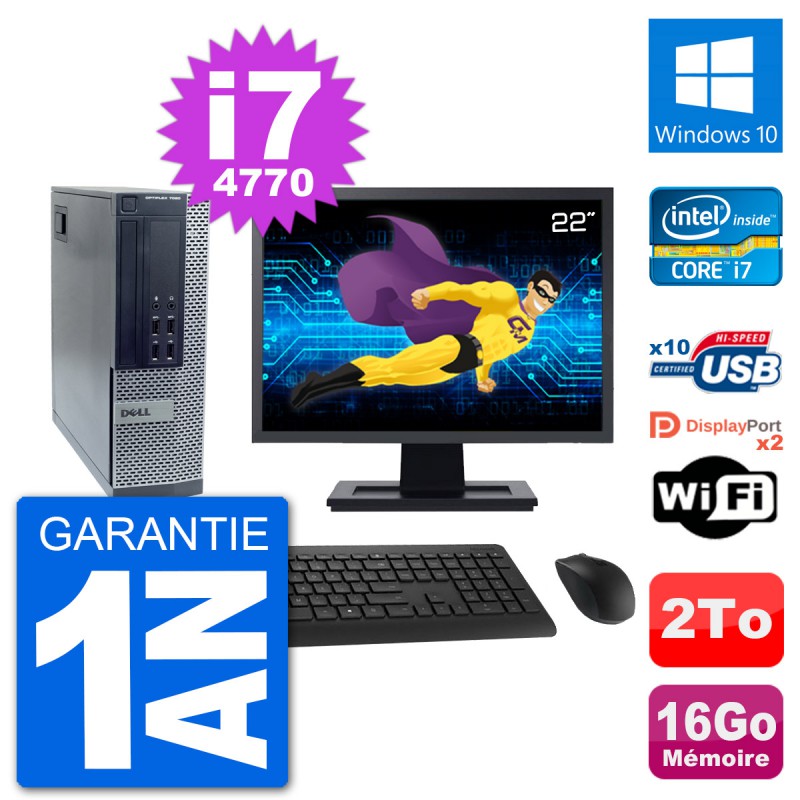 PC Dell 7020 SFF (Slim) - Intel Core i7-4770 3.4 Ghz (8 Mo) - 16 Go DDR3 - Disque Dur 3,5" 2 To - Graveur DVD - Clef Wifi USB - Windows 10 - Livré avec Ecran 22" + clavier + souris (Marques et modèles variables) - Garantie 1 an.