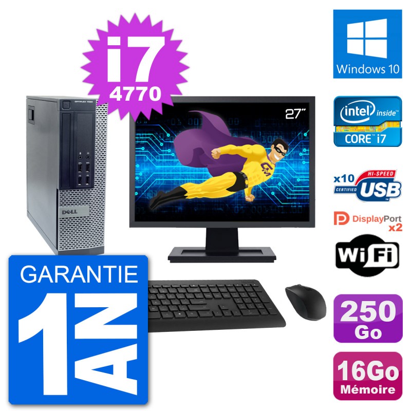 PC Dell 7020 SFF (Slim) - Intel Core i7-4770 3.4 Ghz (8 Mo) - 16 Go DDR3 - Disque Dur 3,5" 250 Go - Graveur DVD - Clef Wifi USB - Windows 10 - Livré avec Ecran 27" + clavier + souris (Marques et modèles variables) - Garantie 1 an.