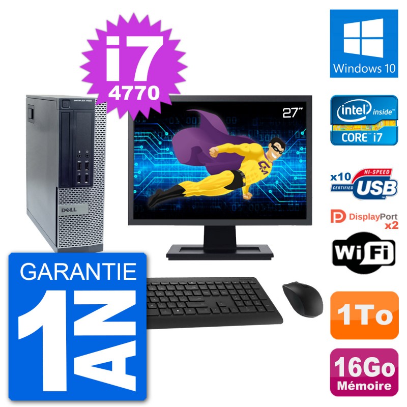 PC Dell 7020 SFF Ecran 27" Intel i7-4770 RAM 16Go Disque Dur 1To Windows 10 Wifi