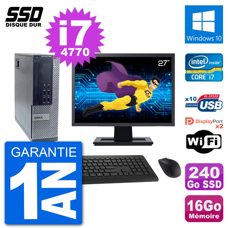 PC Dell 7020 SFF (Slim) - Intel Core i7-4770 3.4 Ghz (8 Mo) - 16 Go DDR3 - Disque Dur SSD 240 Go - Graveur DVD - Clef Wifi USB - Windows 10 - Livré avec Ecran 27" + clavier + souris (Marques et modèles variables) - Garantie 1 an.