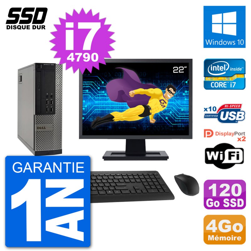 PC Dell 7020 SFF (Slim) - Intel Core i7-4790 3.6 Ghz (8 Mo) - 4 Go DDR3 - Disque Dur SSD 120 Go - Graveur DVD - Clef Wifi USB - Windows 10 - Livré avec Ecran 22" + clavier + souris (Marques et modèles variables) - Garantie 1 an.