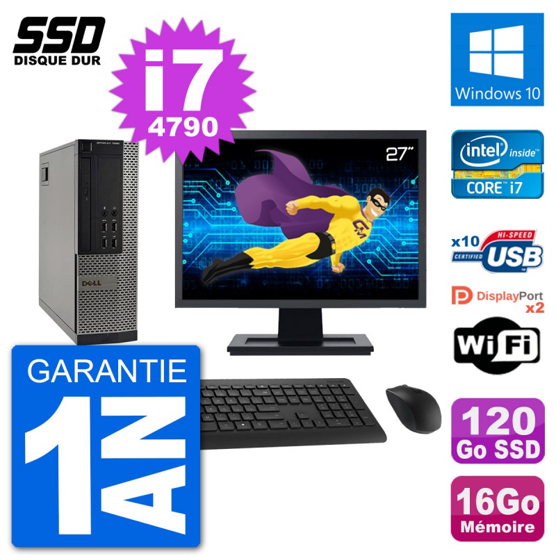 PC Dell 7020 SFF (Slim) - Intel Core i7-4790 3.6 Ghz (8 Mo) - 16 Go DDR3 - Disque Dur SSD 120 Go - Graveur DVD - Clef Wifi USB - Windows 10 - Livré avec Ecran 27" + clavier + souris (Marques et modèles variables) - Garantie 1 an.