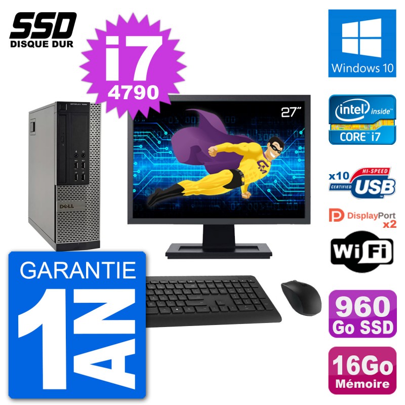 PC Dell 7020 SFF (Slim) - Intel Core i7-4790 3.6 Ghz (8 Mo) - 16 Go DDR3 - Disque Dur SSD 960 Go - Graveur DVD - Clef Wifi USB - Windows 10 - Livré avec Ecran 27" + clavier + souris (Marques et modèles variables) - Garantie 1 an.