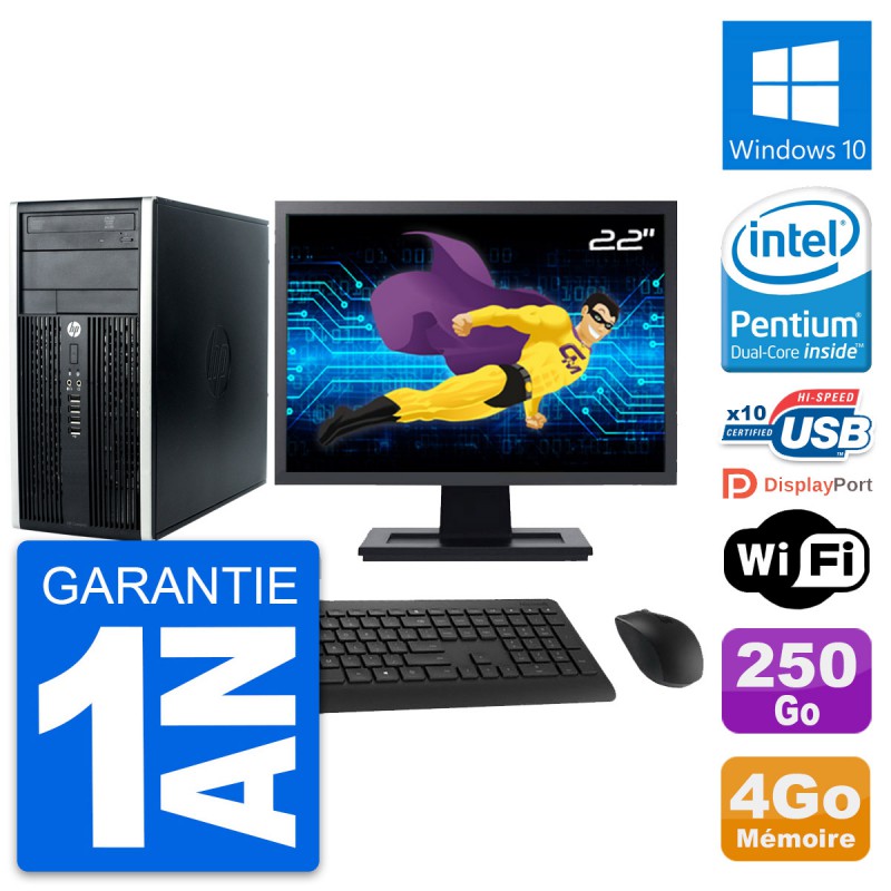 PC HP Pro 6300 CMT (Micro Tour) - Intel Pentium Dual-Core G630 2.7 Ghz (3 Mo) - 4 Go DDR3 - Disque Dur 3,5" 250 Go - Graveur DVD - Clef Wifi USB - Windows 10 - Livré avec Ecran 22" + clavier + souris (Marques et modèles variables) - Garantie 1 an.