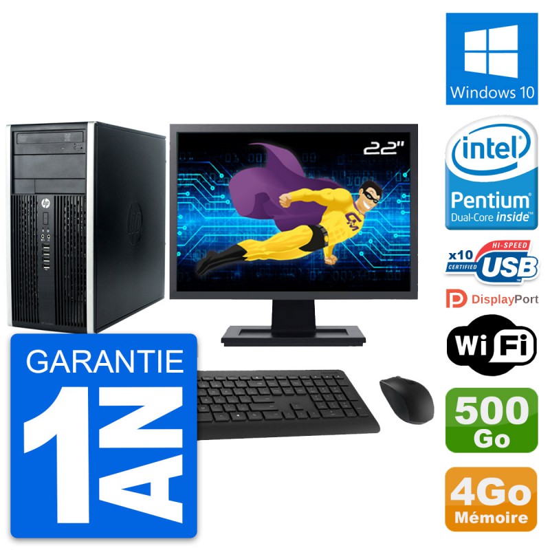 PC HP Pro 6300 CMT (Micro Tour) - Intel Pentium Dual-Core G630 2.7 Ghz (3 Mo) - 4 Go DDR3 - Disque Dur 3,5" 500 Go - Graveur DVD - Clef Wifi USB - Windows 10 - Livré avec Ecran 22" + clavier + souris (Marques et modèles variables) - Garantie 1 an.