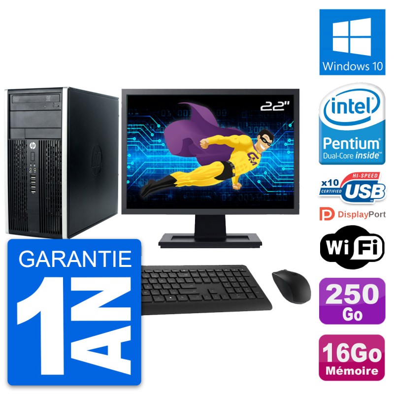 PC HP Pro 6300 CMT (Micro Tour) - Intel Pentium Dual-Core G630 2.7 Ghz (3 Mo) - 16 Go DDR3 - Disque Dur 3,5" 250 Go - Graveur DVD - Clef Wifi USB - Windows 10 - Livré avec Ecran 22" + clavier + souris (Marques et modèles variables) - Garantie 1 an.
