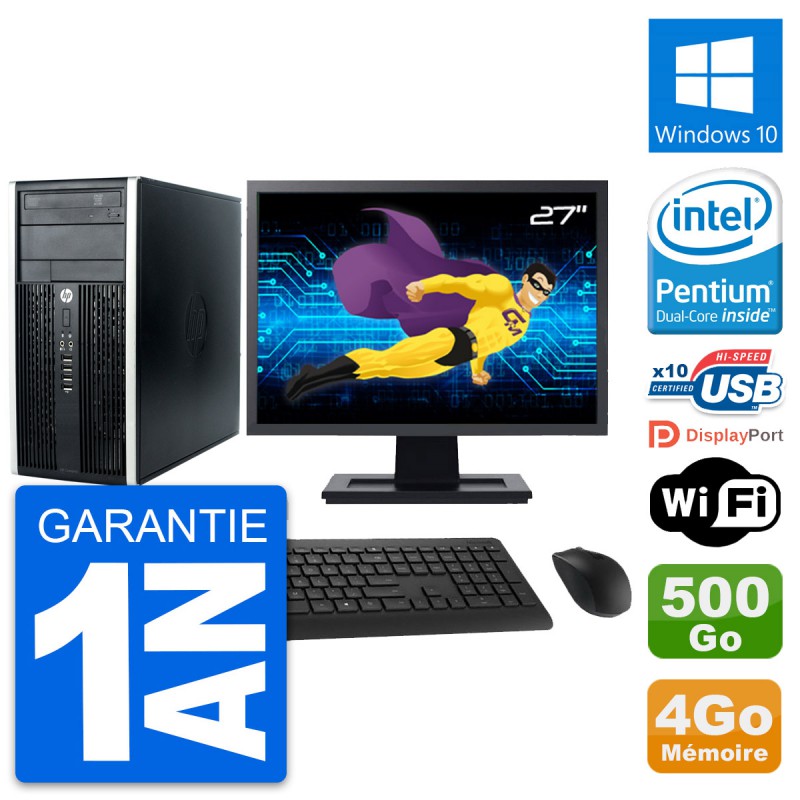 PC HP Pro 6300 CMT (Micro Tour) - Intel Pentium Dual-Core G630 2.7 Ghz (3 Mo) - 4 Go DDR3 - Disque Dur 3,5" 500 Go - Graveur DVD - Clef Wifi USB - Windows 10 - Livré avec Ecran 27" + clavier + souris (Marques et modèles variables) - Garantie 1 an.