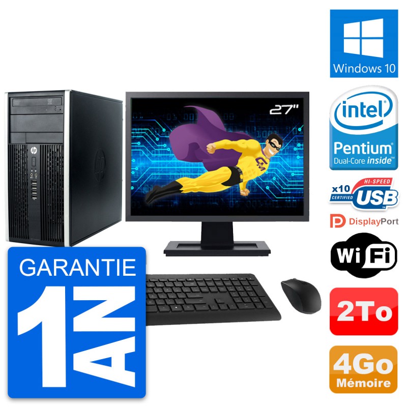 PC HP Pro 6300 CMT (Micro Tour) - Intel Pentium Dual-Core G630 2.7 Ghz (3 Mo) - 4 Go DDR3 - Disque Dur 3,5" 2 To - Graveur DVD - Clef Wifi USB - Windows 10 - Livré avec Ecran 27" + clavier + souris (Marques et modèles variables) - Garantie 1 an.
