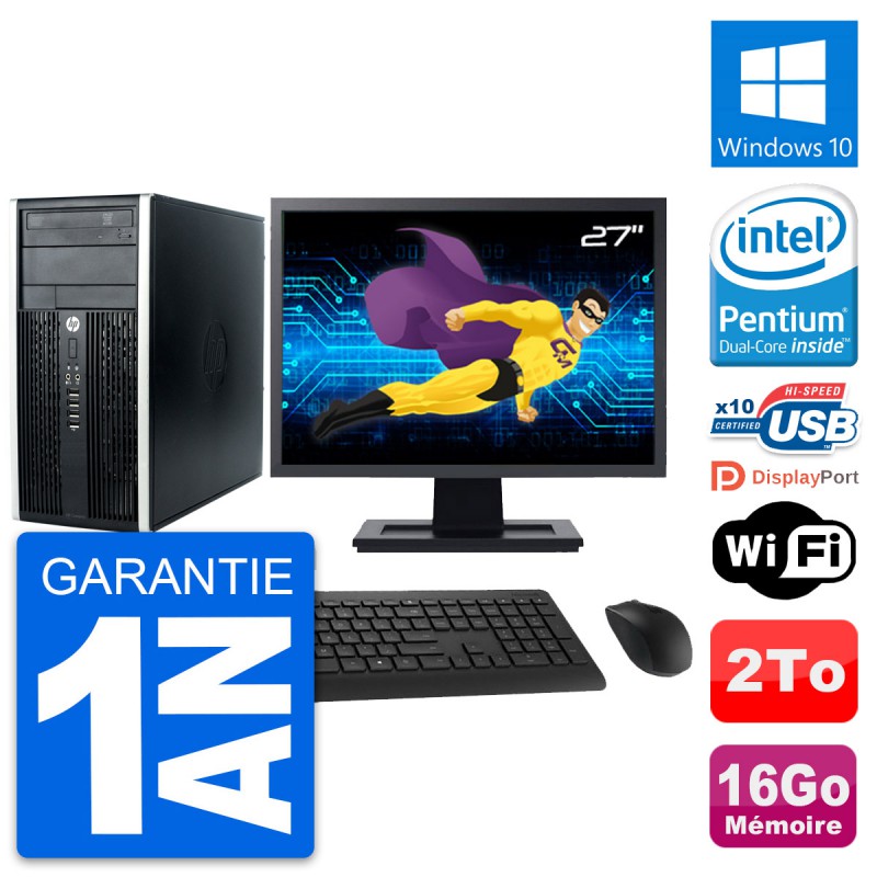 PC HP Pro 6300 CMT (Micro Tour) - Intel Pentium Dual-Core G630 2.7 Ghz (3 Mo) - 16 Go DDR3 - Disque Dur 3,5" 2 To - Graveur DVD - Clef Wifi USB - Windows 10 - Livré avec Ecran 27" + clavier + souris (Marques et modèles variables) - Garantie 1 an.