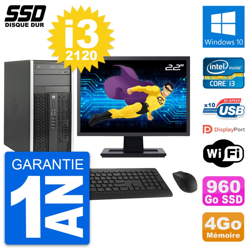 PC HP Pro 6300 CMT (Micro Tour) - Intel Core i3-2120 3.3 Ghz (3 Mo) - 4 Go DDR3 - Disque Dur SSD 960 Go - Graveur DVD - Clef Wifi USB - Windows 10 - Livré avec Ecran 22" + clavier + souris (Marques et modèles variables) - Garantie 1 an.