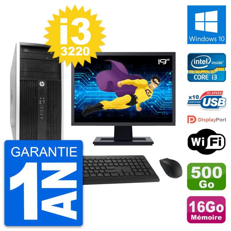 PC HP Pro 6300 CMT (Micro Tour) - Intel Core i3-3220 3.3 Ghz (3 Mo) - 16 Go DDR3 - Disque Dur 3,5" 500 Go - Graveur DVD - Clef Wifi USB - Windows 10 - Livré avec Ecran 19" + clavier + souris (Marques et modèles variables) - Garantie 1 an.