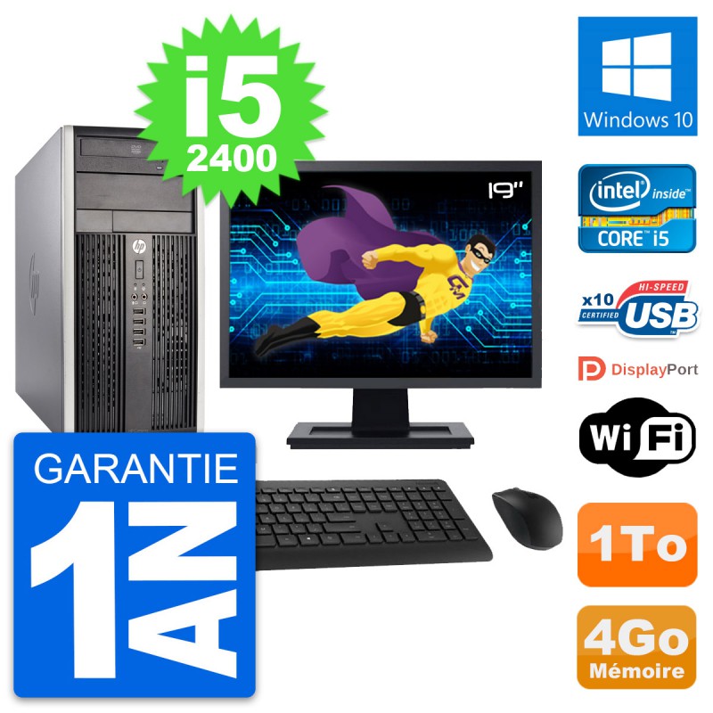 PC HP Pro 6300 CMT (Micro Tour) - Intel Core i5-2400 3.1 Ghz (6 Mo) - 4 Go DDR3 - Disque Dur 3,5" 1 To - Graveur DVD - Clef Wifi USB - Windows 10 - Livré avec Ecran 19" + clavier + souris (Marques et modèles variables) - Garantie 1 an.