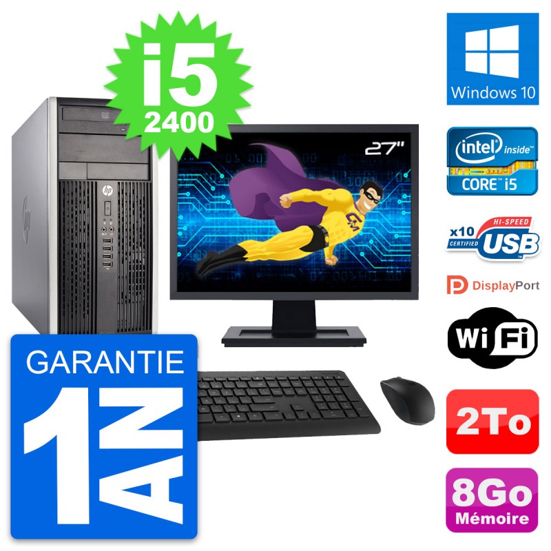 PC HP Pro 6300 CMT (Micro Tour) - Intel Core i5-2400 3.1 Ghz (6 Mo) - 8 Go DDR3 - Disque Dur 3,5" 2 To - Graveur DVD - Clef Wifi USB - Windows 10 - Livré avec Ecran 27" + clavier + souris (Marques et modèles variables) - Garantie 1 an.
