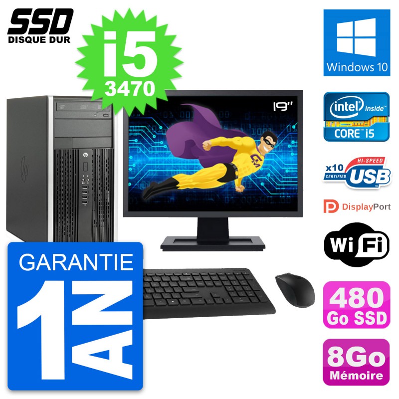 PC HP Pro 6300 CMT (Micro Tour) - Intel Core i5-3470 3.2 Ghz (6 Mo) - 8 Go DDR3 - Disque Dur SSD 480 Go - Graveur DVD - Clef Wifi USB - Windows 10 - Livré avec Ecran 19" + clavier + souris (Marques et modèles variables) - Garantie 1 an.