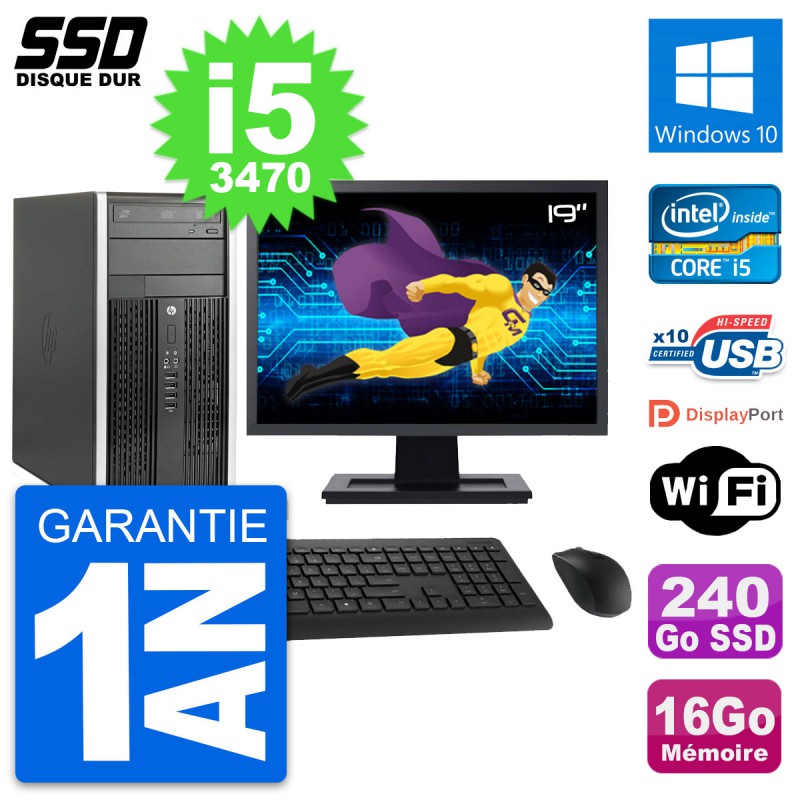 PC HP Pro 6300 CMT (Micro Tour) - Intel Core i5-3470 3.2 Ghz (6 Mo) - 16 Go DDR3 - Disque Dur SSD 240 Go - Graveur DVD - Clef Wifi USB - Windows 10 - Livré avec Ecran 19" + clavier + souris (Marques et modèles variables) - Garantie 1 an.