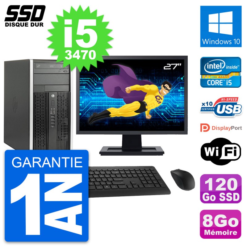 PC HP Pro 6300 CMT (Micro Tour) - Intel Core i5-3470 3.2 Ghz (6 Mo) - 8 Go DDR3 - Disque Dur SSD 120 Go - Graveur DVD - Clef Wifi USB - Windows 10 - Livré avec Ecran 27" + clavier + souris (Marques et modèles variables) - Garantie 1 an.