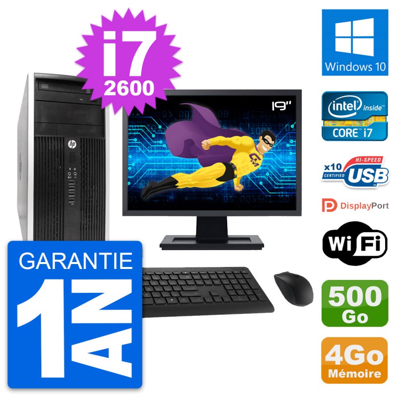 PC HP Pro 6300 CMT (Micro Tour) - Intel Core i7-2600 3.4 Ghz (8 Mo) - 4 Go DDR3 - Disque Dur 3,5" 500 Go - Graveur DVD - Clef Wifi USB - Windows 10 - Livré avec Ecran 19" + clavier + souris (Marques et modèles variables) - Garantie 1 an.