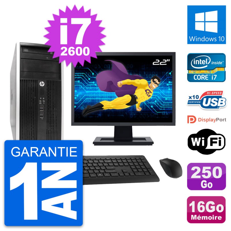 PC HP Pro 6300 CMT (Micro Tour) - Intel Core i7-2600 3.4 Ghz (8 Mo) - 16 Go DDR3 - Disque Dur 3,5" 250 Go - Graveur DVD - Clef Wifi USB - Windows 10 - Livré avec Ecran 22" + clavier + souris (Marques et modèles variables) - Garantie 1 an.