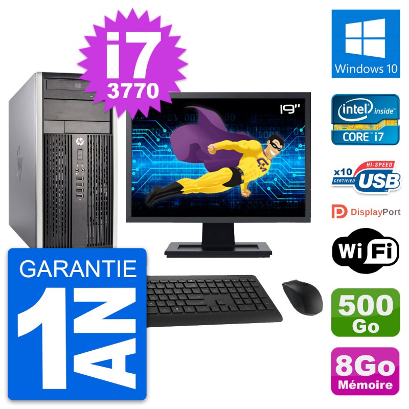 PC HP Pro 6300 CMT (Micro Tour) - Intel Core i7-3770 3.4 Ghz (8 Mo) - 8 Go DDR3 - Disque Dur 3,5" 500 Go - Graveur DVD - Clef Wifi USB - Windows 10 - Livré avec Ecran 19" + clavier + souris (Marques et modèles variables) - Garantie 1 an.