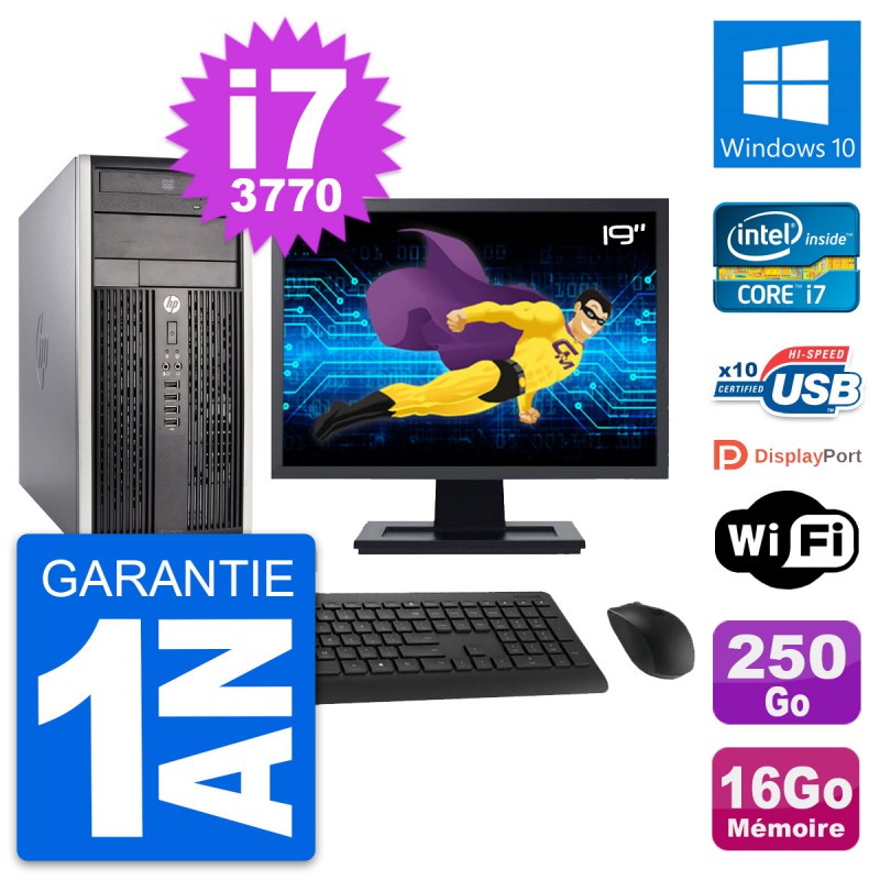 PC HP Pro 6300 CMT (Micro Tour) - Intel Core i7-3770 3.4 Ghz (8 Mo) - 16 Go DDR3 - Disque Dur 3,5" 250 Go - Graveur DVD - Clef Wifi USB - Windows 10 - Livré avec Ecran 19" + clavier + souris (Marques et modèles variables) - Garantie 1 an.