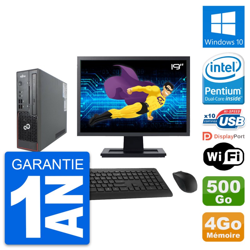 Mini PC Fujitsu C720 - Intel Pentium Dual-Core G3220 3.0 Ghz (3 Mo) - 4 Go DDR3 - Disque Dur 3,5" 500 Go - Graveur DVD - Clef Wifi USB - Windows 10 - Livré avec Ecran 19" + clavier + souris (Marques et modèles variables) - Garantie 1 an.