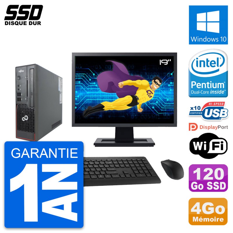 Mini PC Fujitsu C720 - Intel Pentium Dual-Core G3220 3.0 Ghz (3 Mo) - 4 Go DDR3 - Disque Dur SSD 120 Go - Graveur DVD - Clef Wifi USB - Windows 10 - Livré avec Ecran 19" + clavier + souris (Marques et modèles variables) - Garantie 1 an.