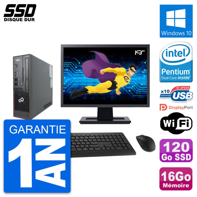 Mini PC Fujitsu C720 - Intel Pentium Dual-Core G3220 3.0 Ghz (3 Mo) - 16 Go DDR3 - Disque Dur SSD 120 Go - Graveur DVD - Clef Wifi USB - Windows 10 - Livré avec Ecran 19" + clavier + souris (Marques et modèles variables) - Garantie 1 an.