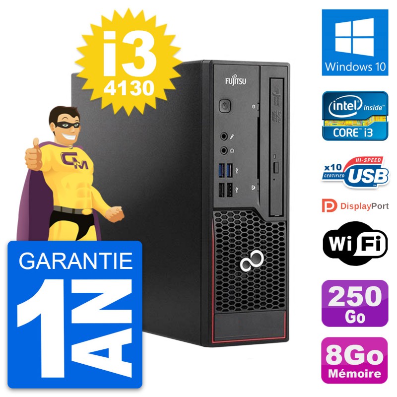 Mini PC Fujitsu C720 format SFF - Intel Core i3-4130 3.4 Ghz (3 Mo) - 8 Go DDR3 - Disque Dur 3,5" 250 Go - Graveur DVD - Clef Wifi USB - Windows 10 - Garantie 1 an.