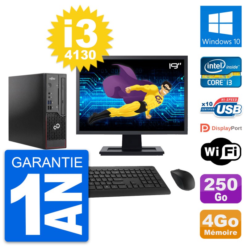 Mini PC Fujitsu C720 format SFF - Intel Core i3-4130 3.4 Ghz (3 Mo) - 4 Go DDR3 - Disque Dur 3,5" 250 Go - Graveur DVD - Clef Wifi USB - Windows 10 - Livré avec Ecran 19" + clavier + souris (Marques et modèles variables) - Garantie 1 an.